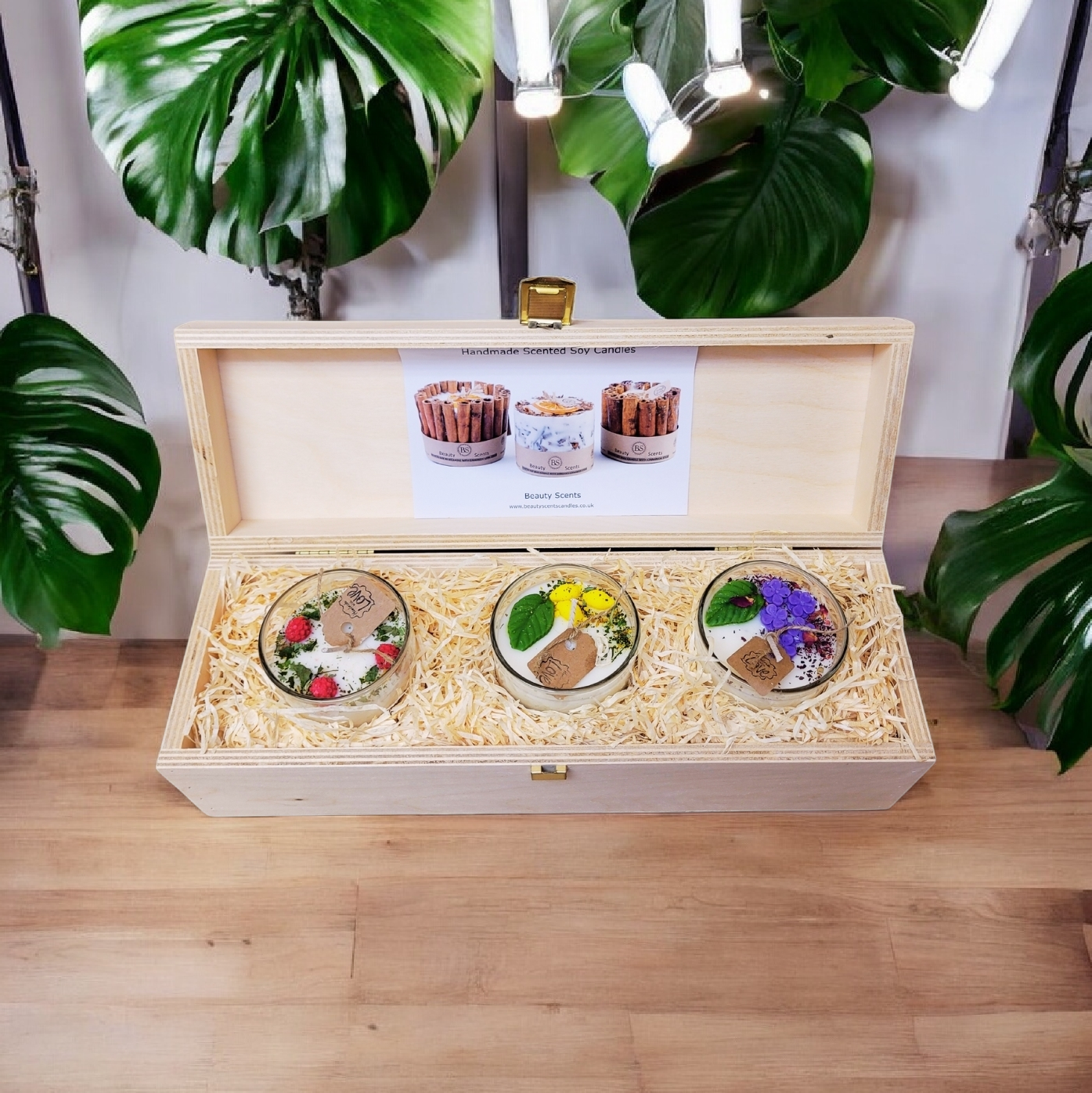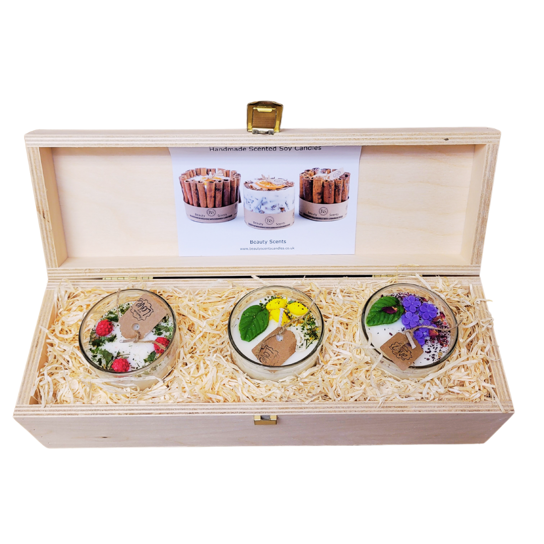 Candles packed in Beauty Scents branded wooden gift box and secured with wood wool.