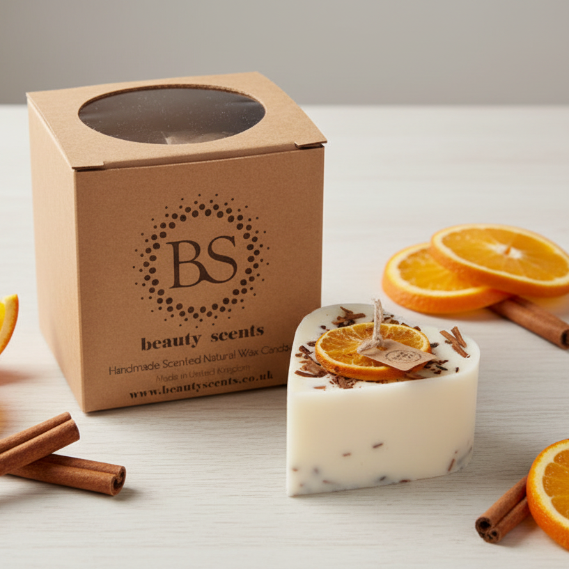 The candle handmade of orange and cinnamon or lime and cinnamon scented soy wax and decorated with shredded cinnamon sticks.