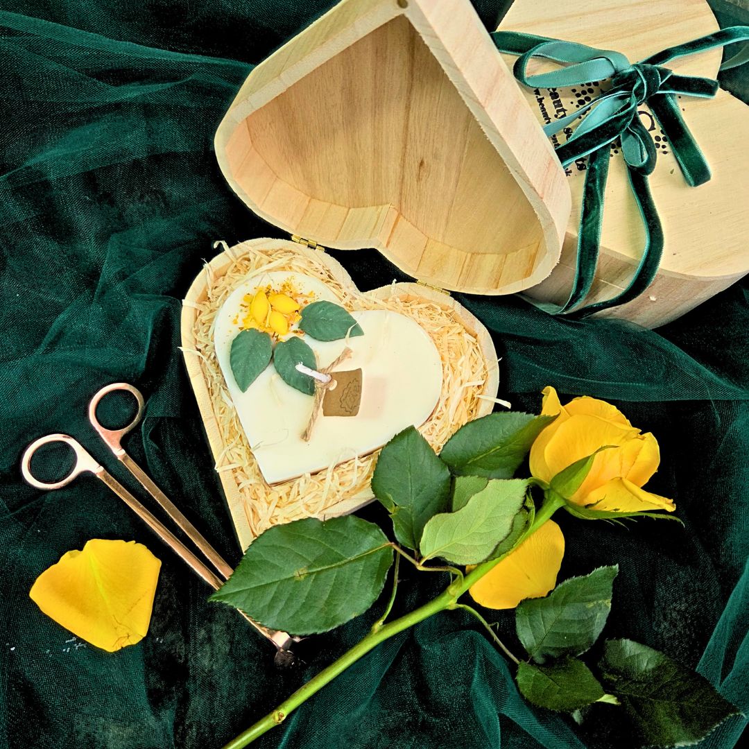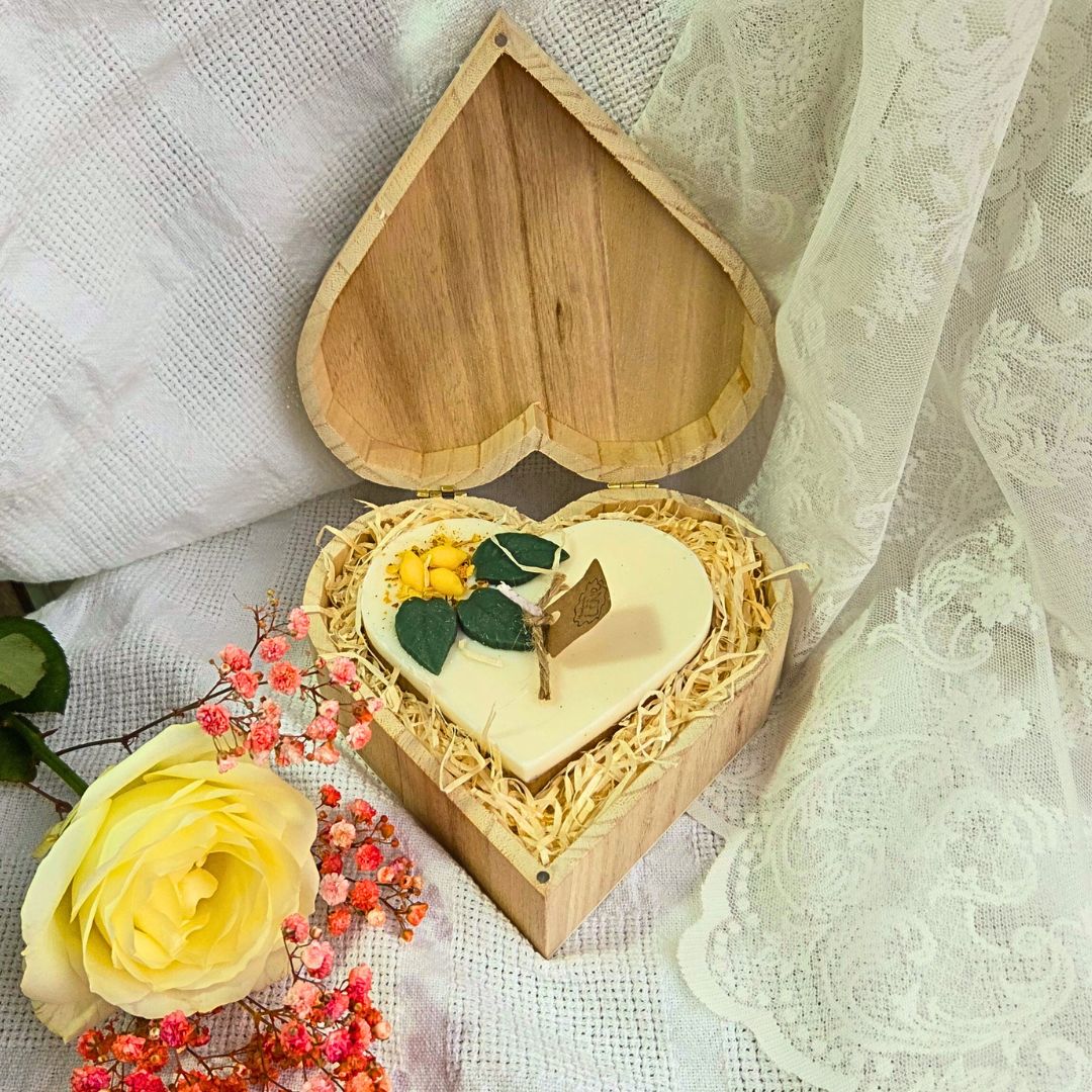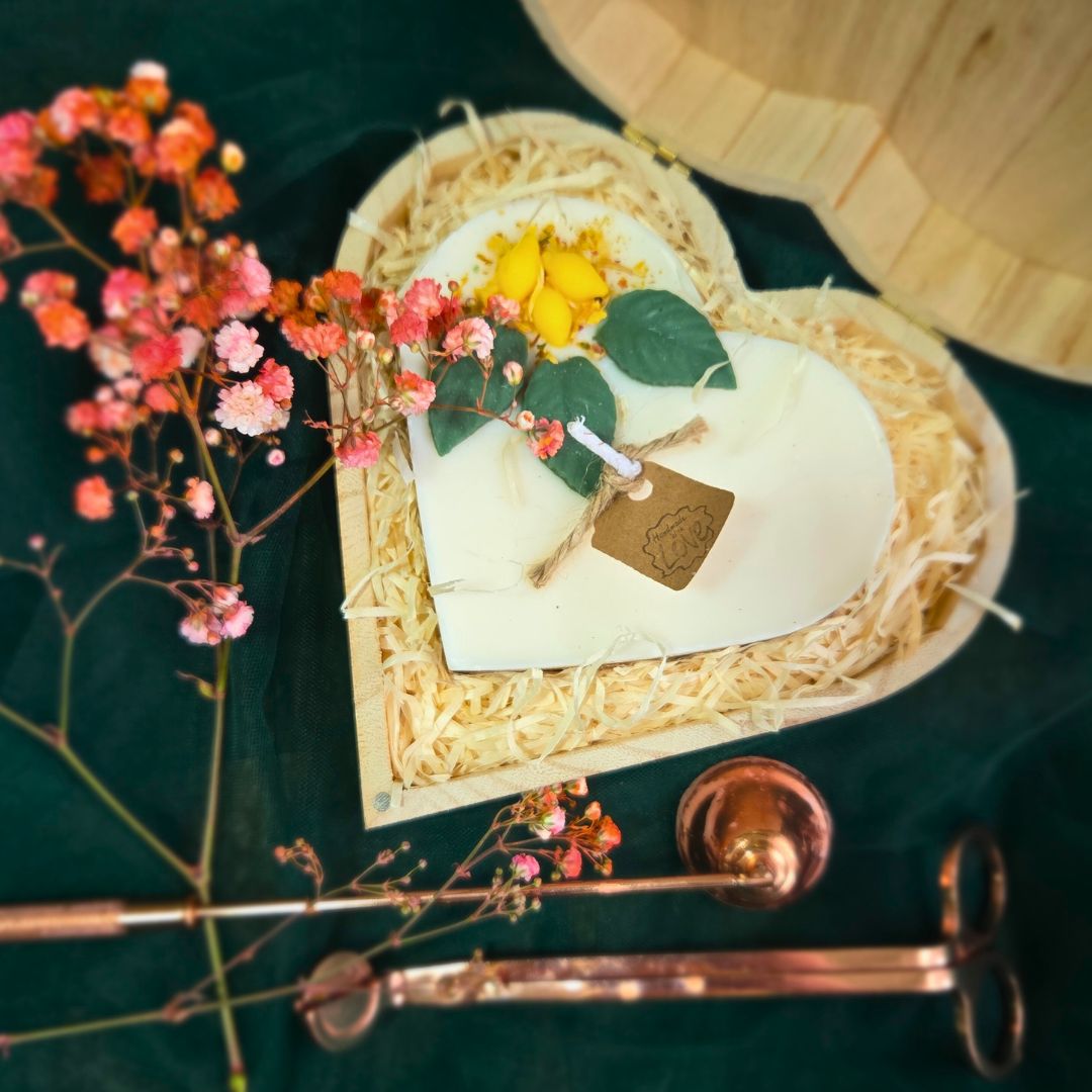 A refreshing addition to any room, this handmade heart candle features lemon wax melts and comes in a rustic wooden heart gift box.