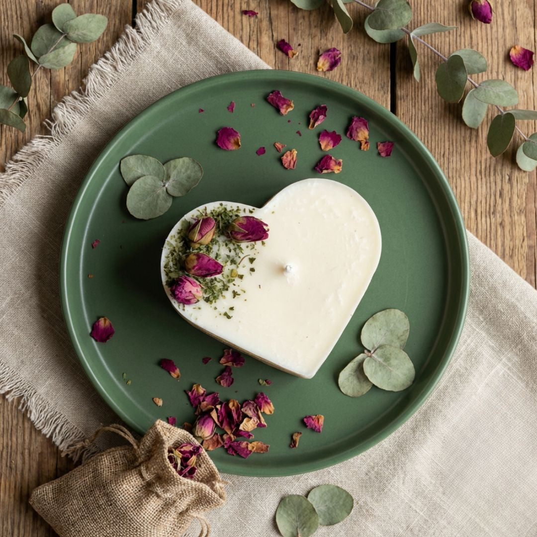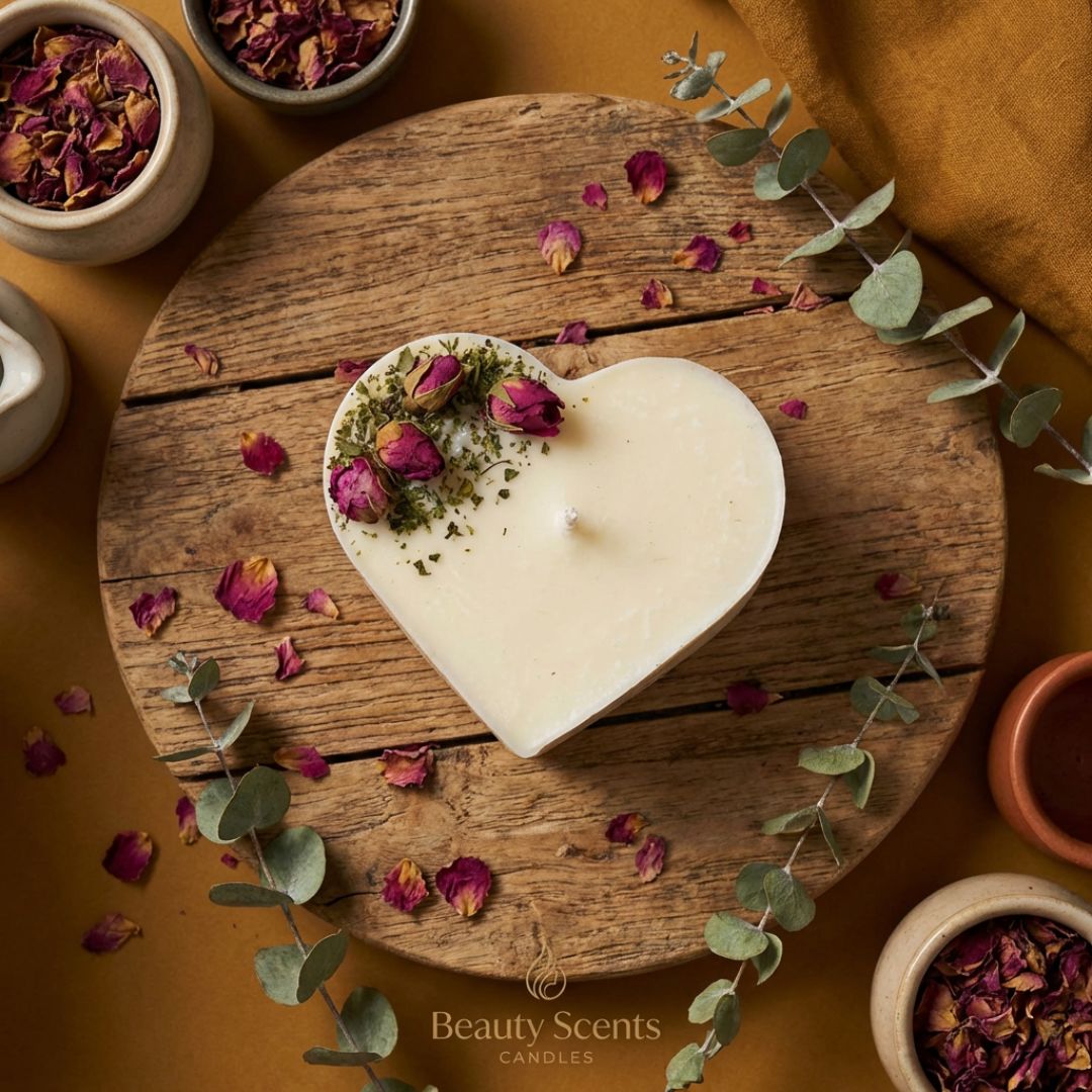 Elegant large heart candle featuring 4 genuine rose buds and botanical greens artfully positioned in a sophisticated corner arrangement. This premium soy candle makes a stunning statement piece while delivering exceptional fragrance throw and romantic atmosphere.