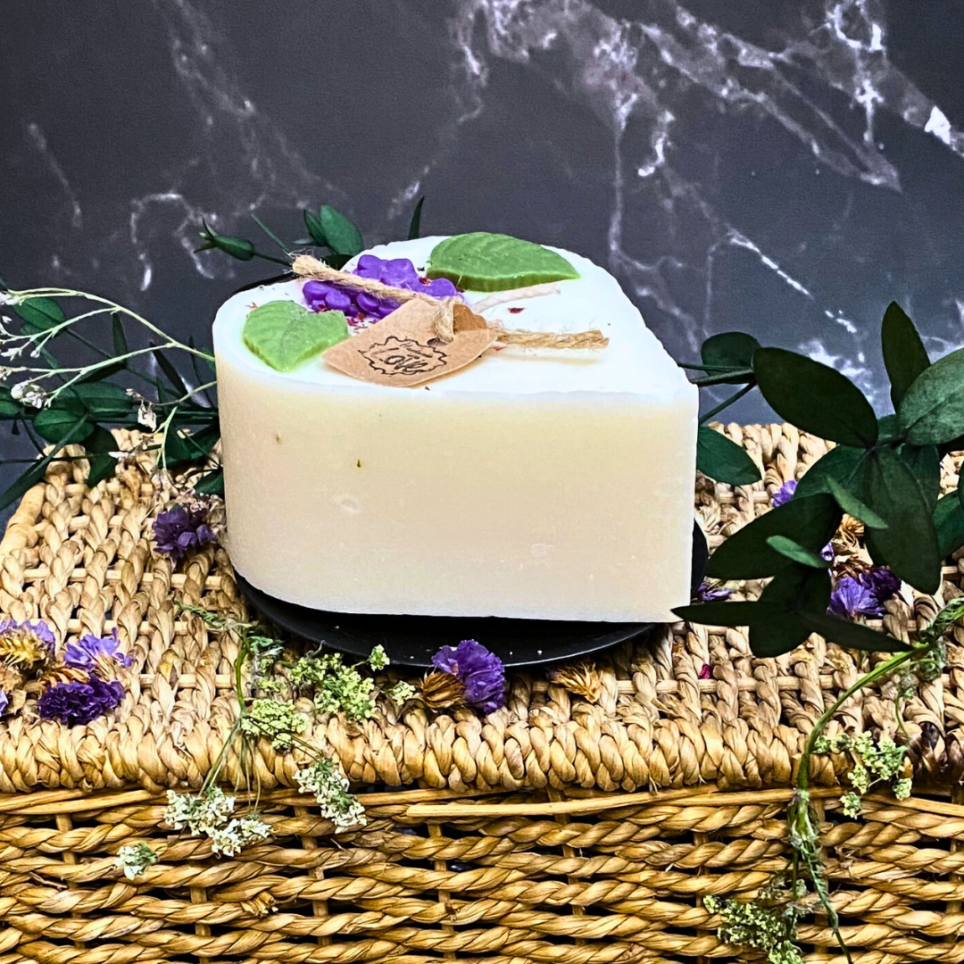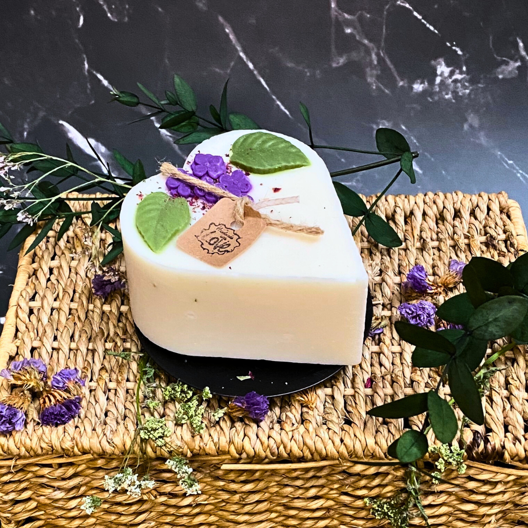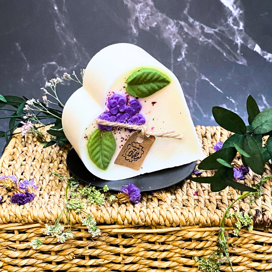 The candle was handmade of soy wax, Fragrance Oil and cotton wick. Decorated with dried grass and coloured lilac and leaf shape wax melts.