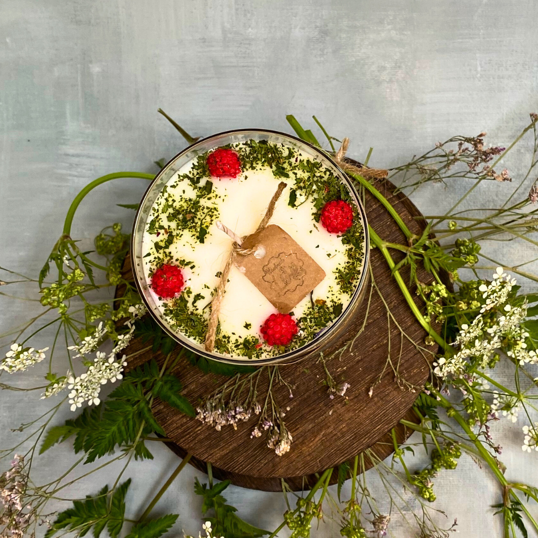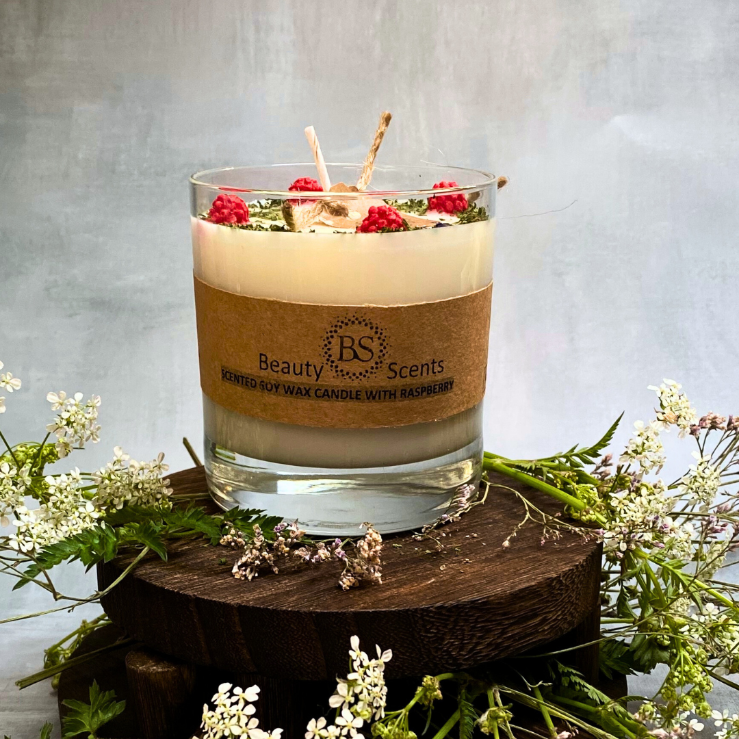 Experience the perfect blend of elegance and fruity freshness with our Large Glass Raspberry Candle. This premium handmade soy candle features stunning red wax berry decorations beautifully presented in a clear glass container.