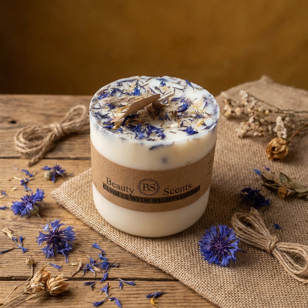 Create a stunning centerpiece with our medium wild flowers candle, beautifully adorned with blue cornflowers and offering four delightful scents for extended aromatic enjoyment.