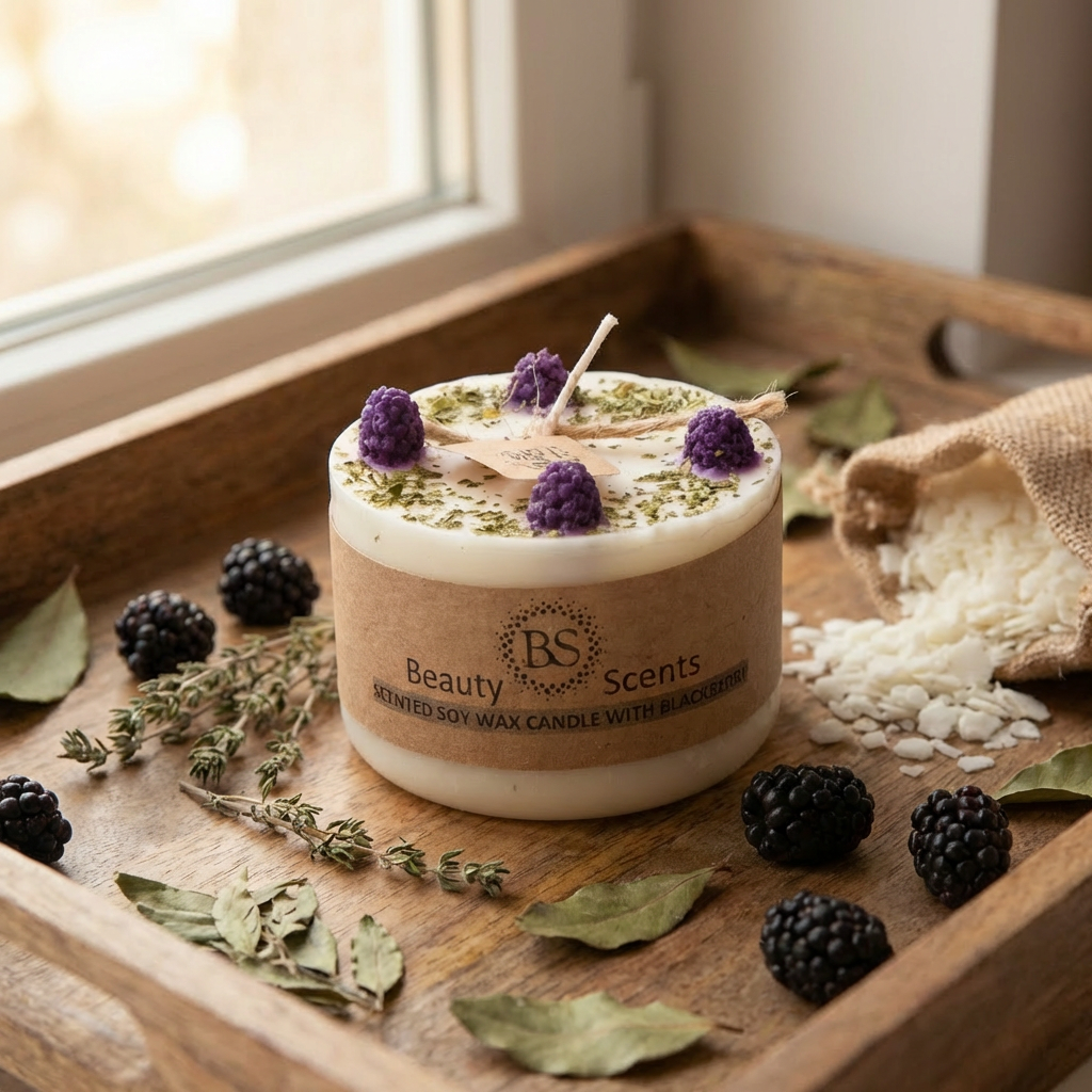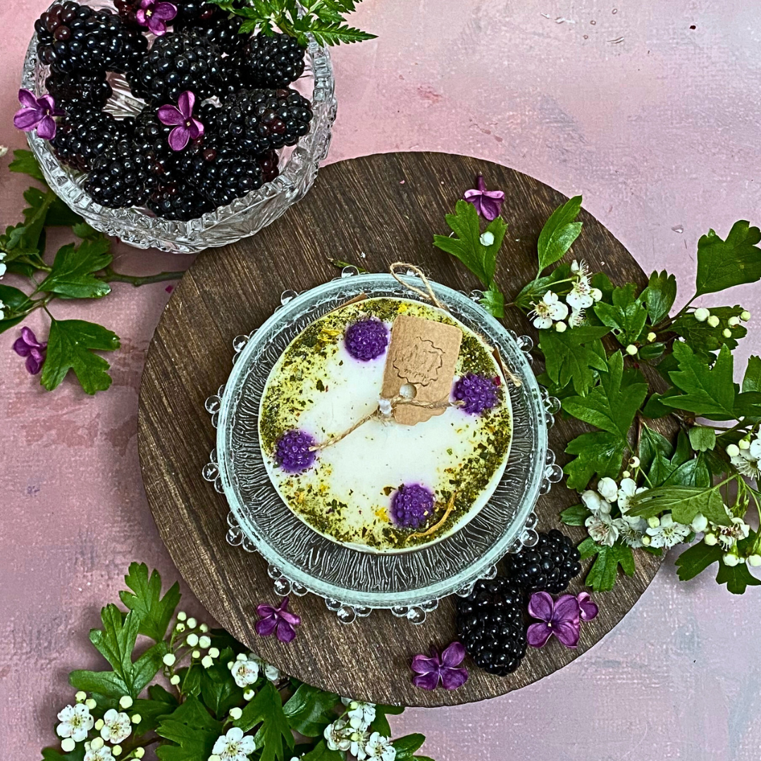 The candle handmade of raspberry, strawberry, pepermint, mulled wine, muscat grape, black currant or lily of the valley scented soy wax and decorated with wax melts in shape of blackberry.