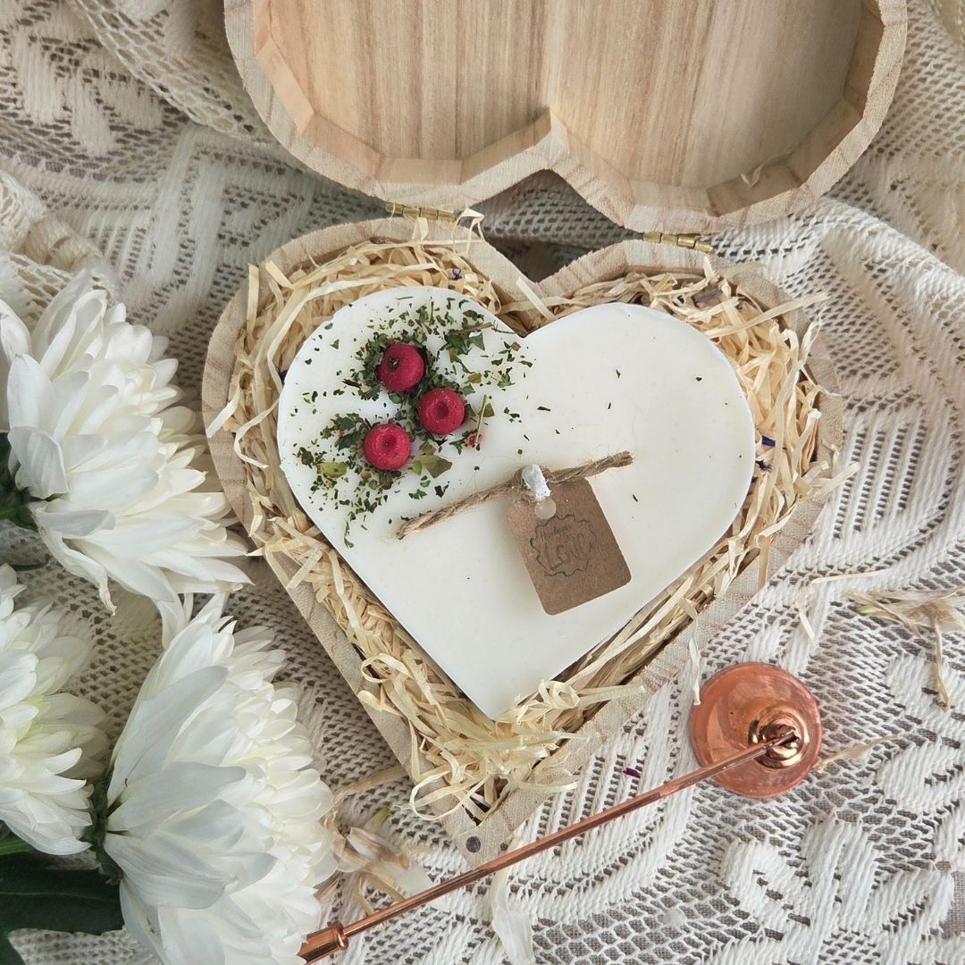 Brighten your space with a handmade heart candle, adorned with red berry wax melts and presented in a charming wooden heart-shaped box.