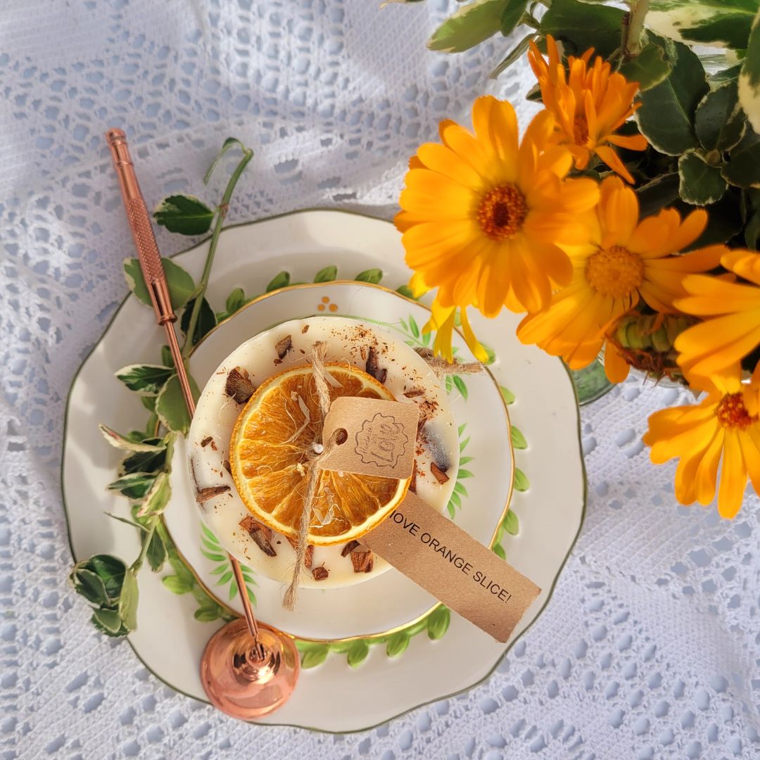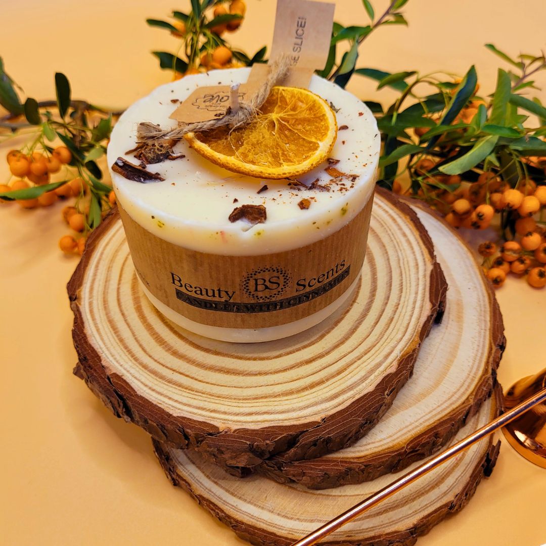 The candle handmade of orange and cinnamon or lime and cinnamon scented soy wax and decorated with shredded cinnamon sticks.